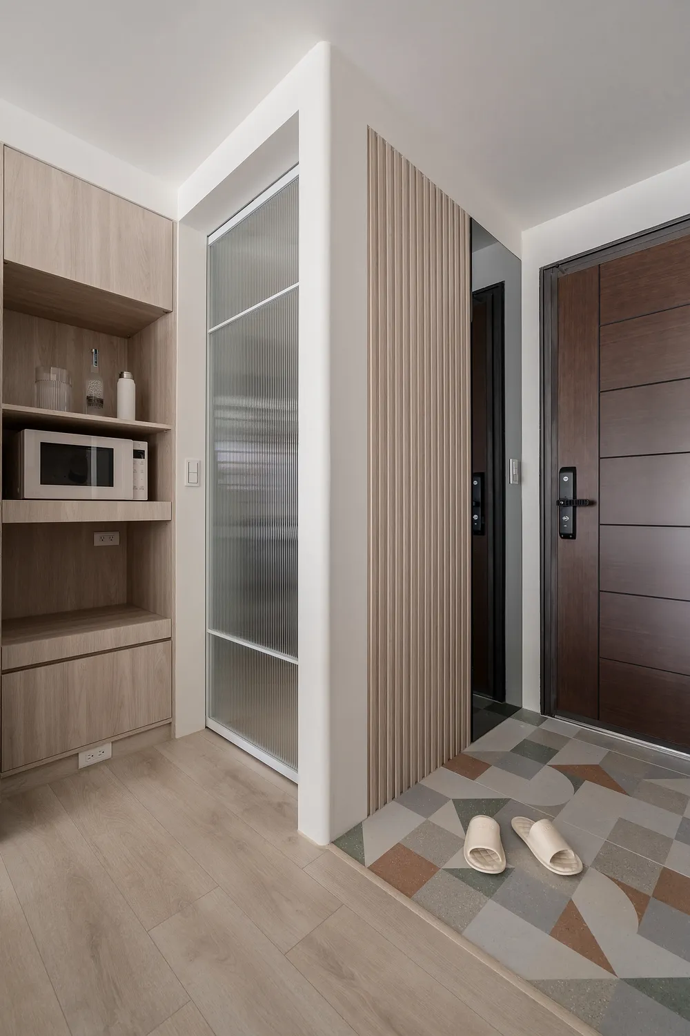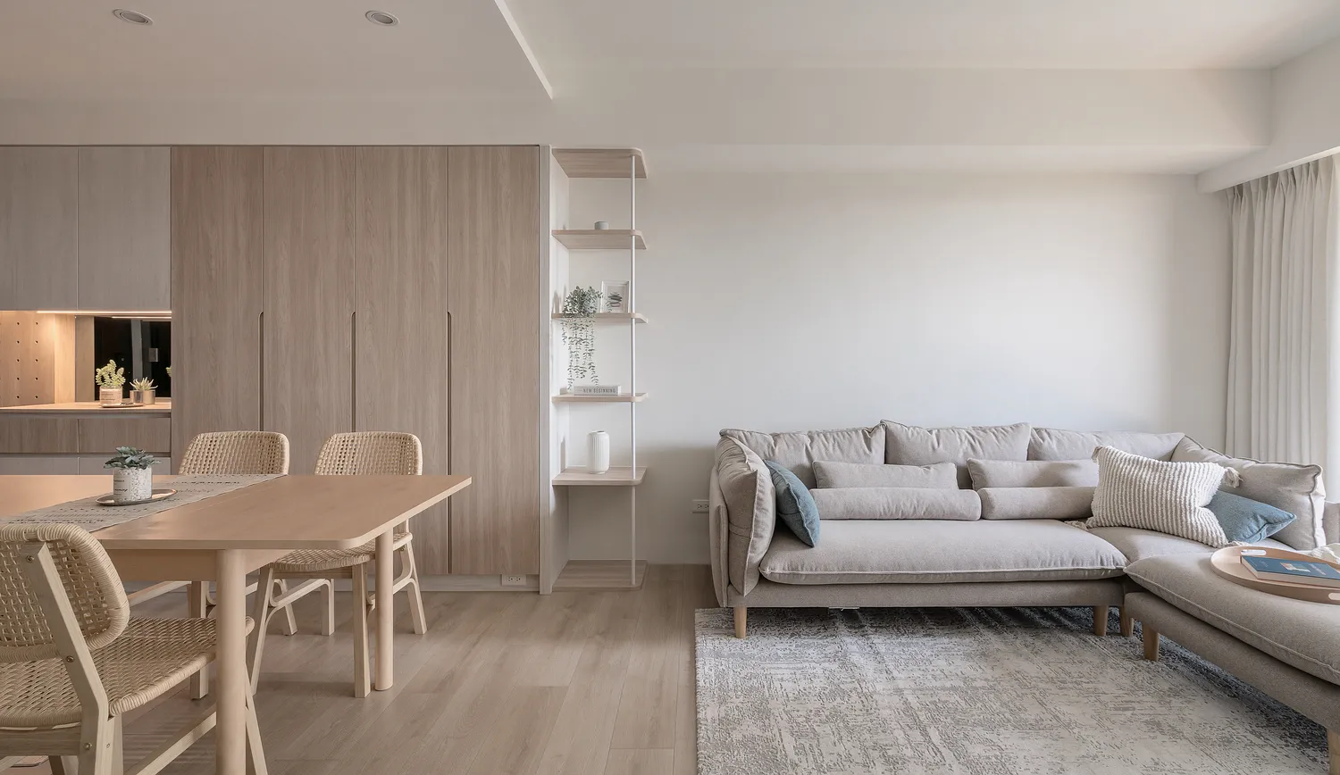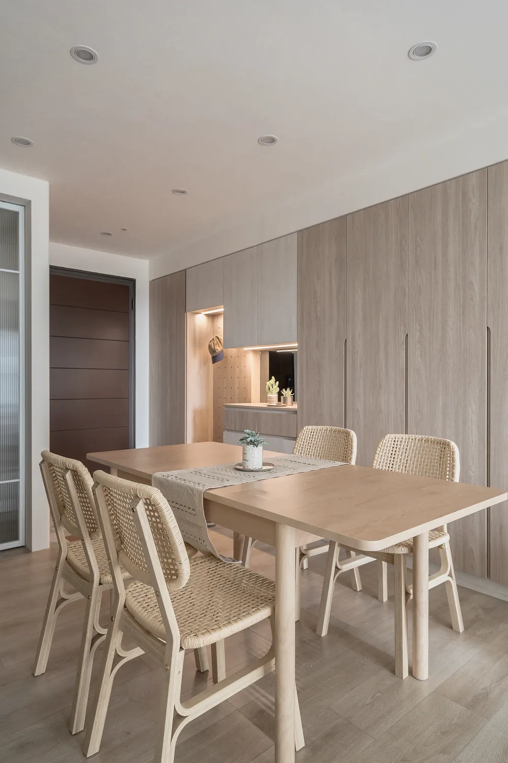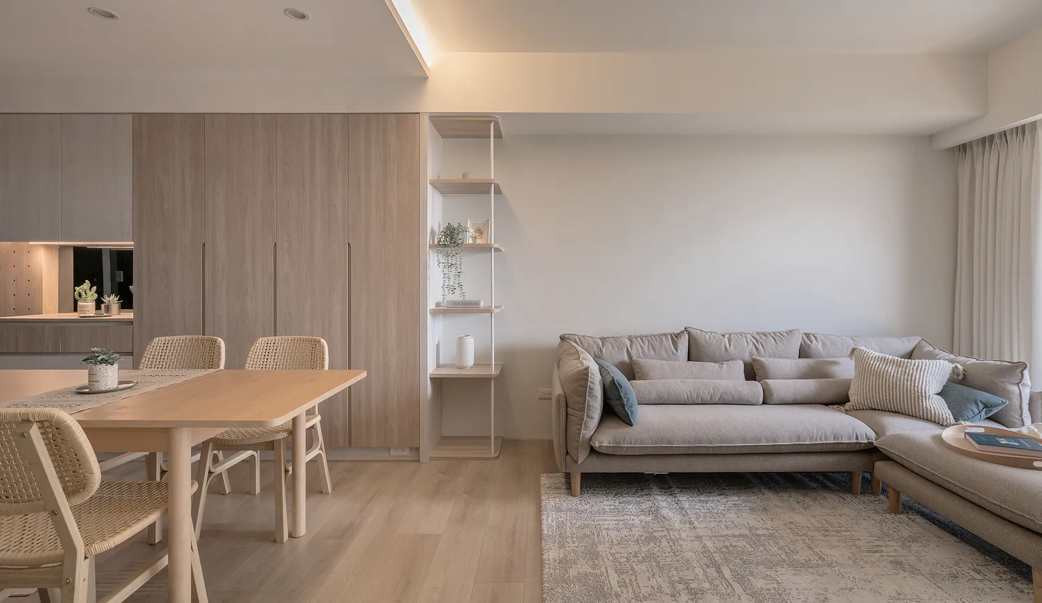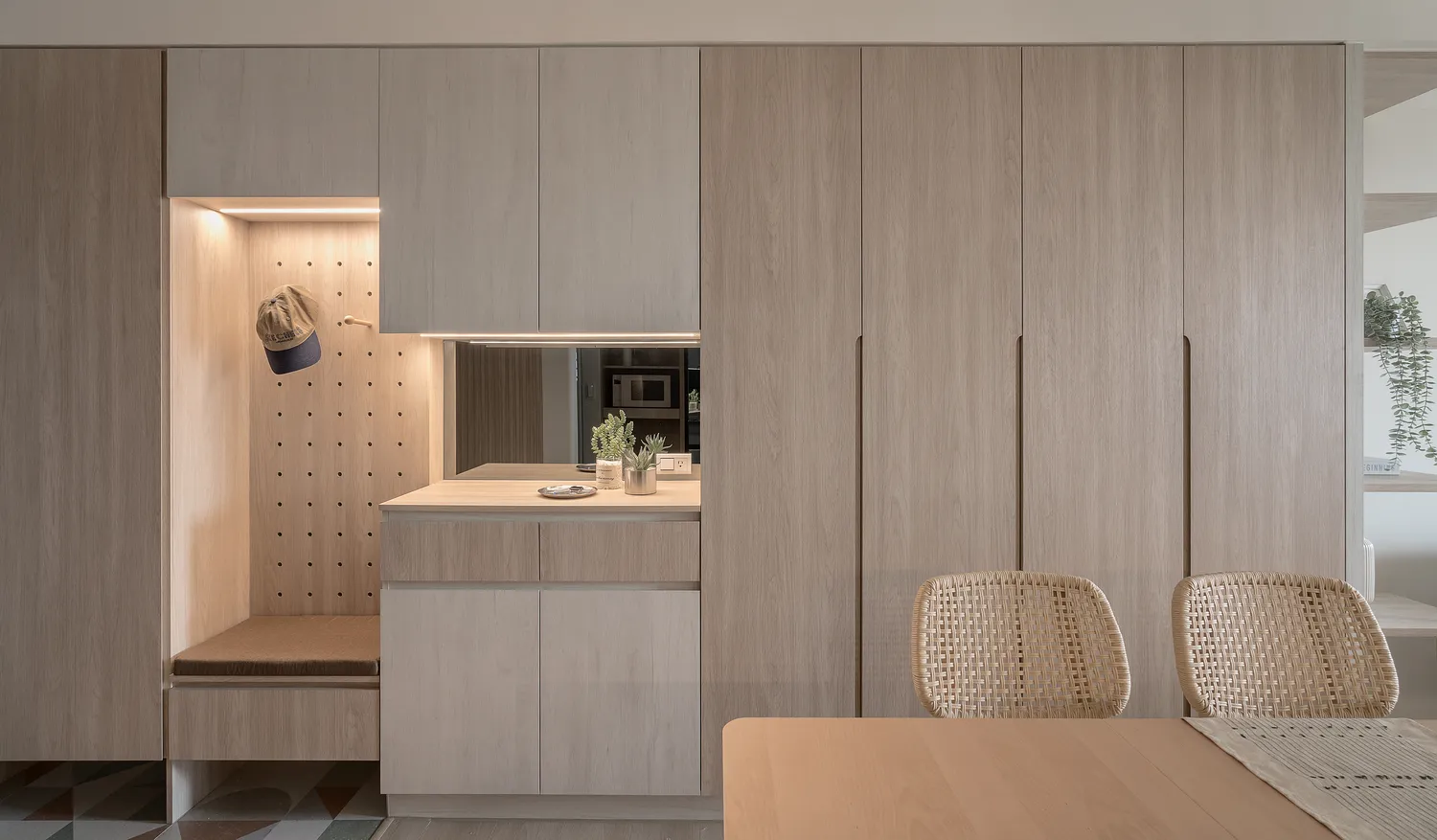 本案以溫潤的淺木紋為基底,點綴著樸質的藤編傢俱,營造出宛如度假般的愜意氛圍; 玄關處的幾何花磚與長虹玻璃,輕巧地劃分了內外,讓回家的步伐變得輕盈; 陽台那株姿態優雅的綠植,將自然的生命力引入室內; 在這個被光影與植栽擁抱的空間裡,日子過得緩慢而舒心。