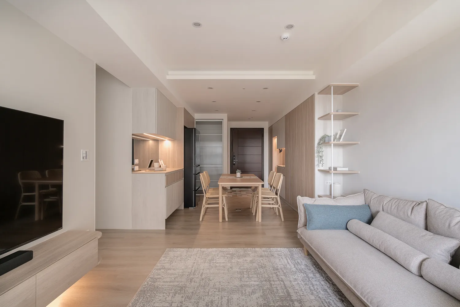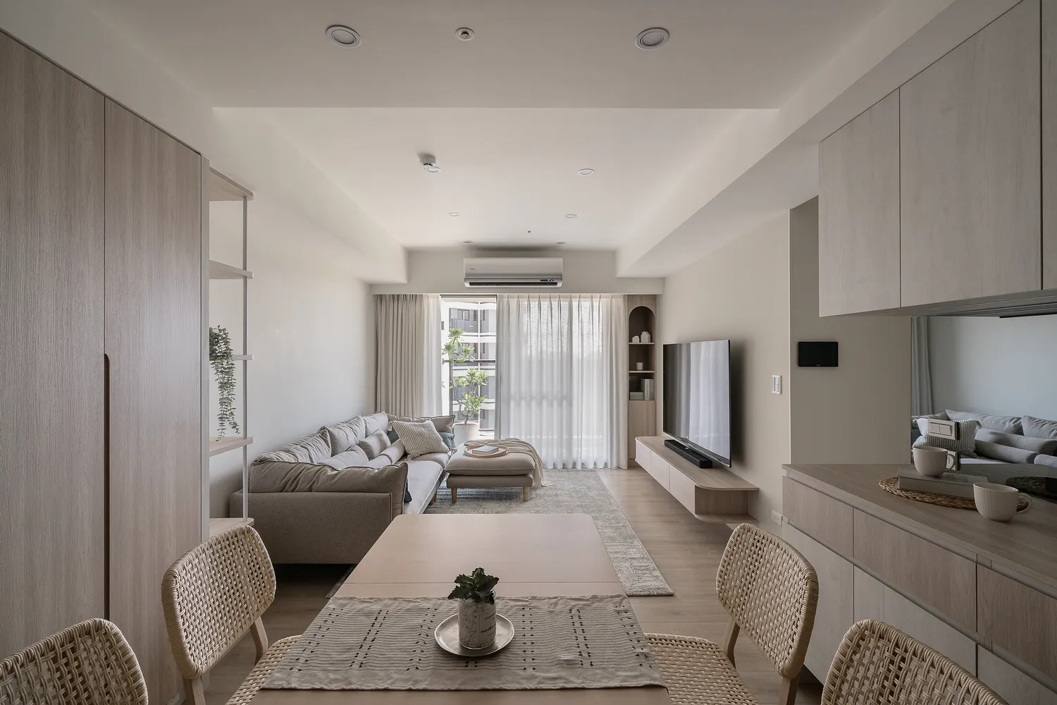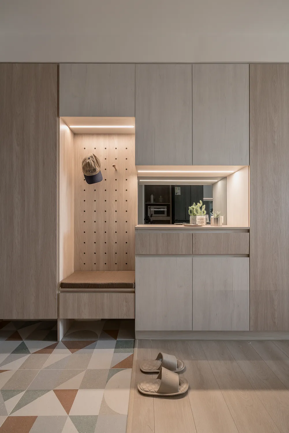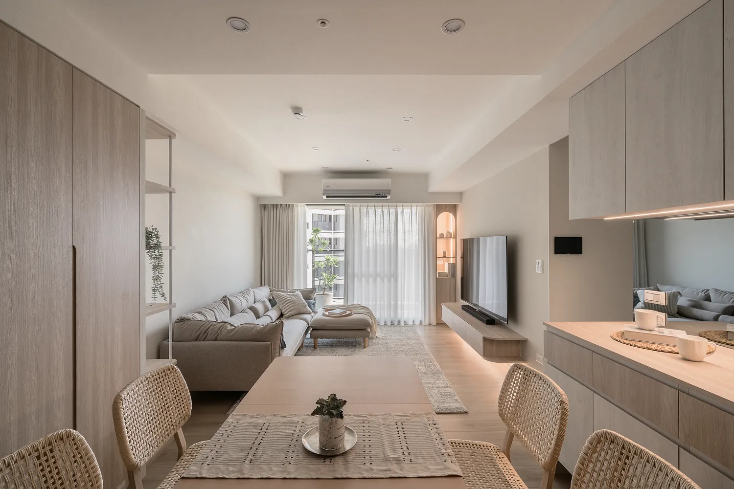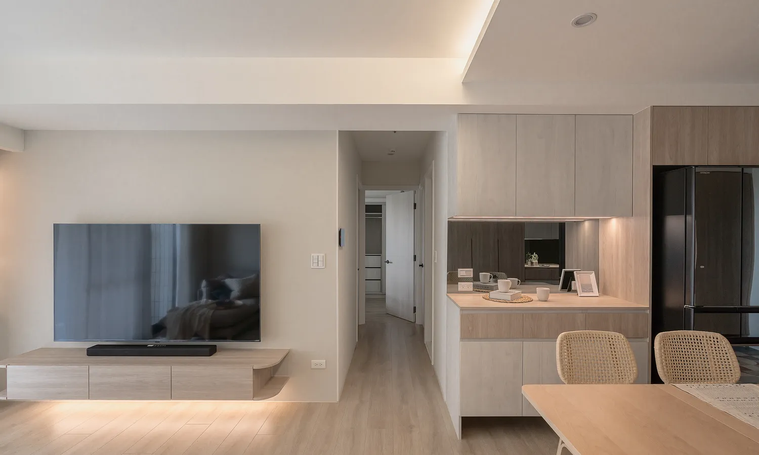本案以溫潤的淺木紋為基底,點綴著樸質的藤編傢俱,營造出宛如度假般的愜意氛圍; 玄關處的幾何花磚與長虹玻璃,輕巧地劃分了內外,讓回家的步伐變得輕盈; 陽台那株姿態優雅的綠植,將自然的生命力引入室內; 在這個被光影與植栽擁抱的空間裡,日子過得緩慢而舒心。