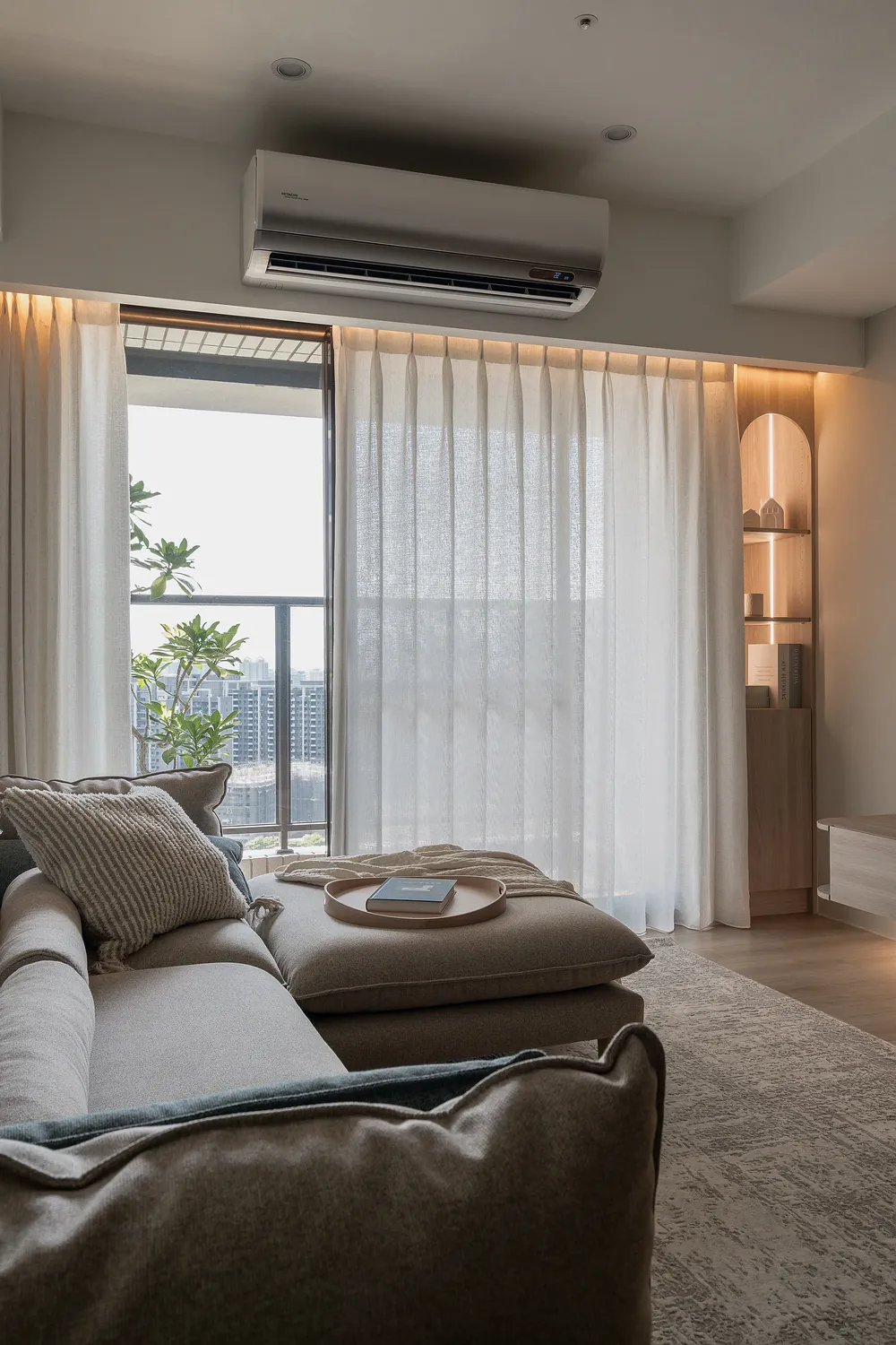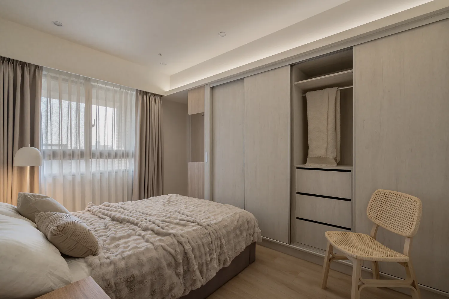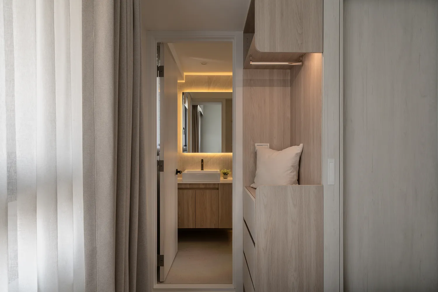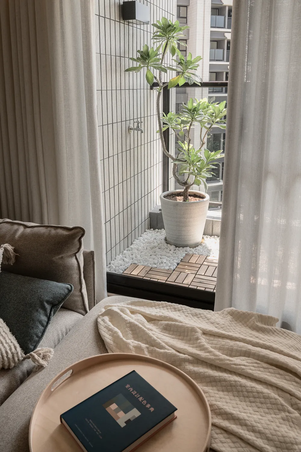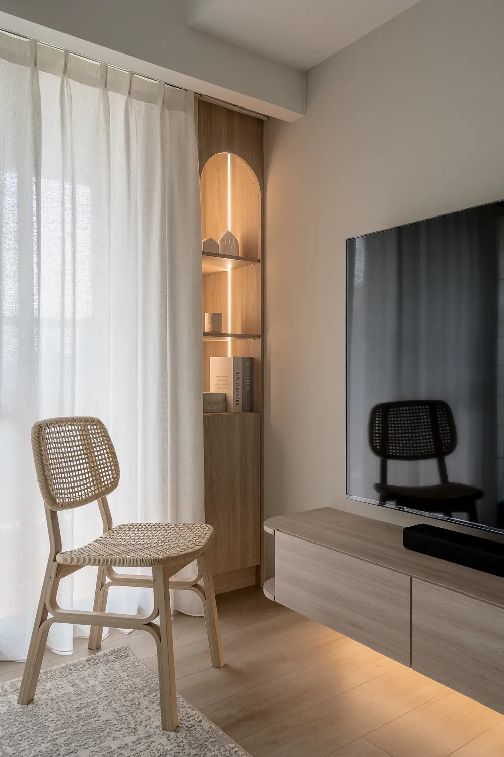 本案以溫潤的淺木紋為基底,點綴著樸質的藤編傢俱,營造出宛如度假般的愜意氛圍; 玄關處的幾何花磚與長虹玻璃,輕巧地劃分了內外,讓回家的步伐變得輕盈; 陽台那株姿態優雅的綠植,將自然的生命力引入室內; 在這個被光影與植栽擁抱的空間裡,日子過得緩慢而舒心。