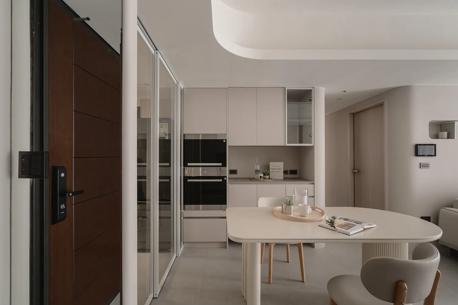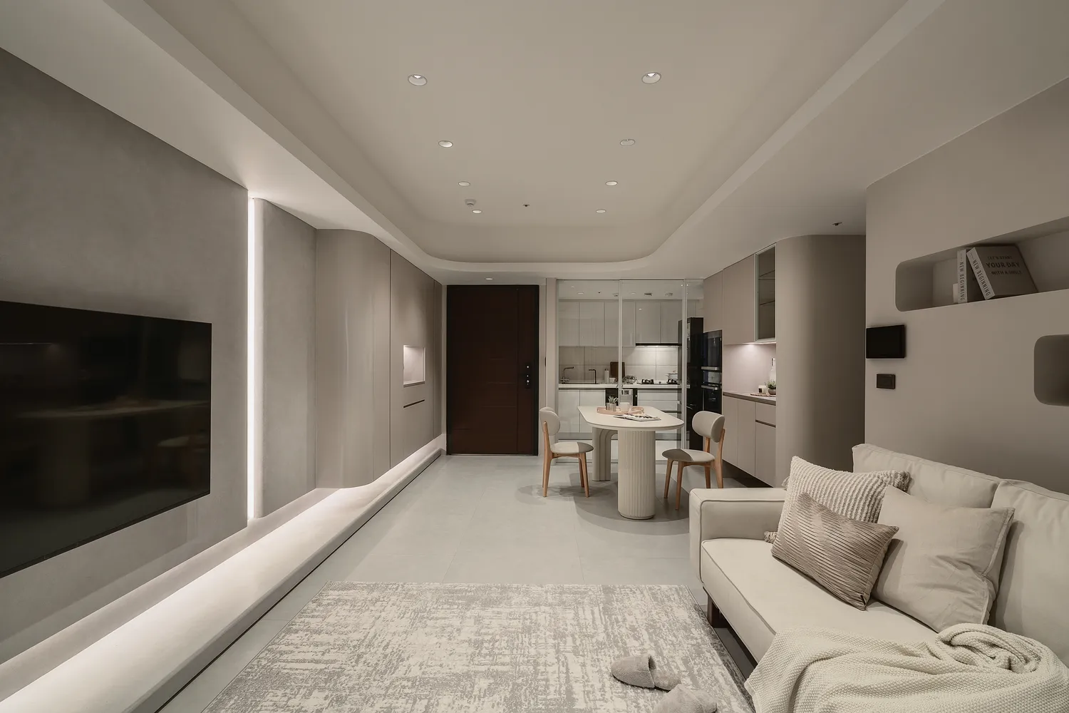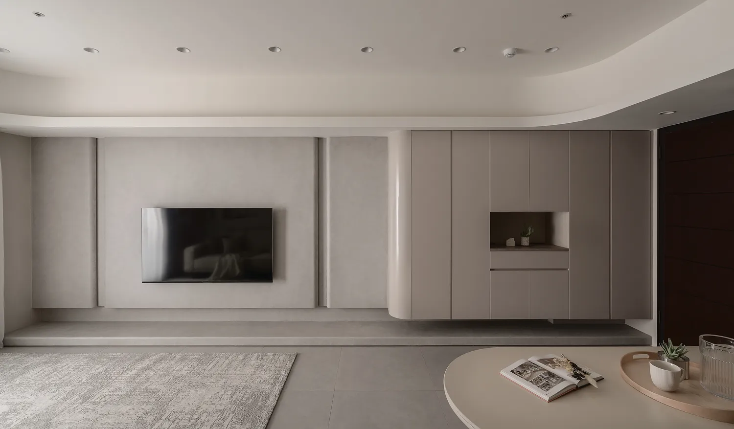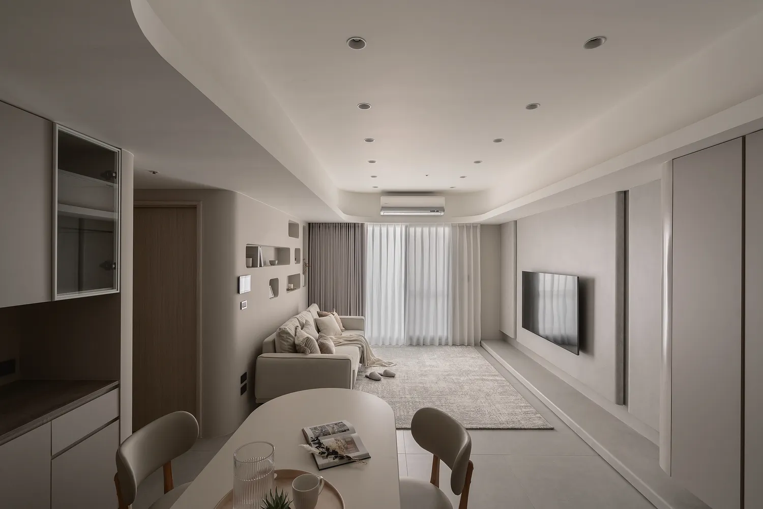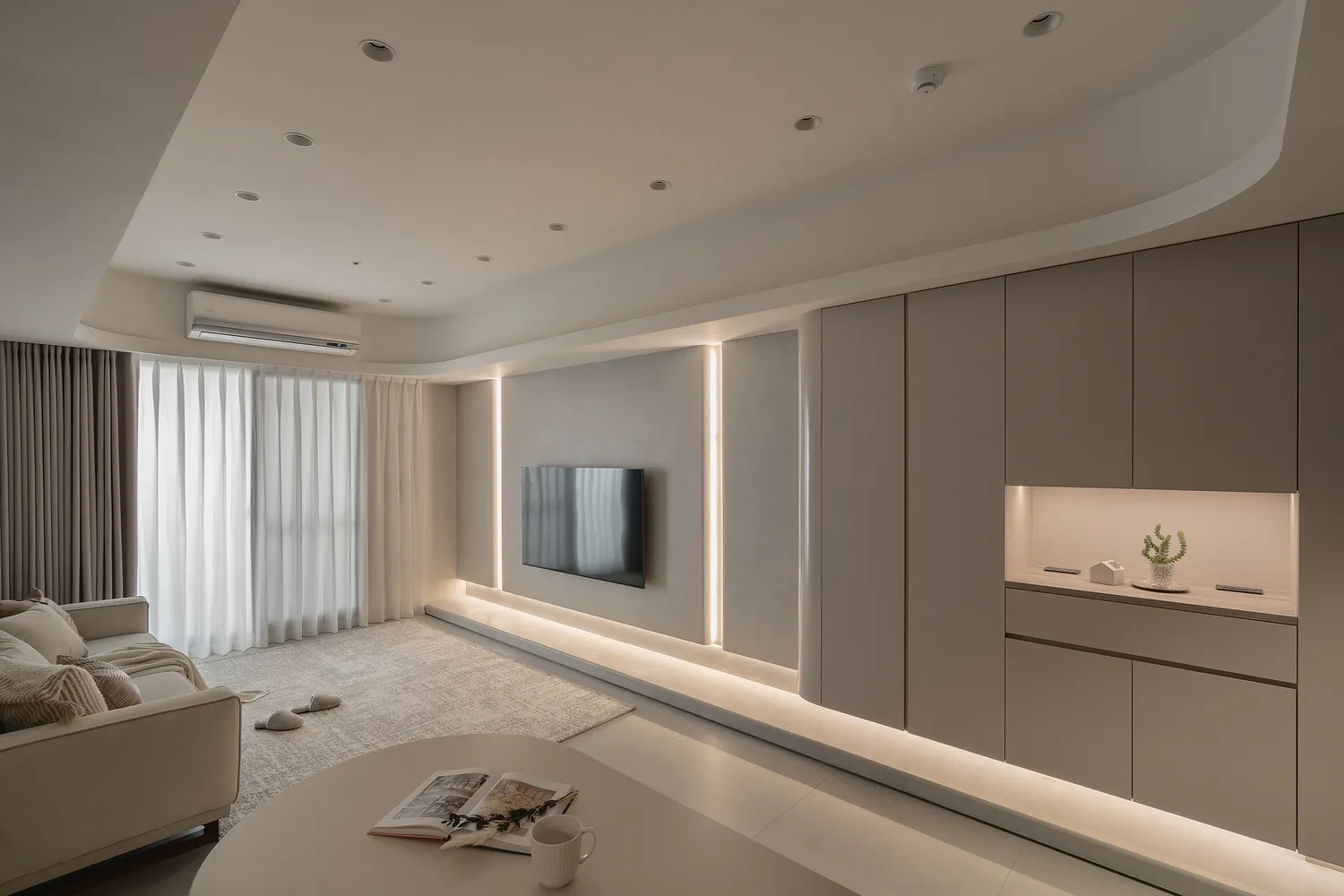 本案以溫潤的燕麥奶茶色系為基底,鋪敘出純淨無壓的視覺感受; 天花板與櫃體轉角運用了大量的圓弧線條,消弭了樑柱的銳利,引導視線隨著空間流動。 沙發背牆的幾何壁龕與臥室那一抹有機光圈,在簡約中勾勒出層次與趣味; 柔和的間接照明輕輕灑落,圍塑出一個讓人卸下疲憊、被溫暖安靜包覆的歸屬。