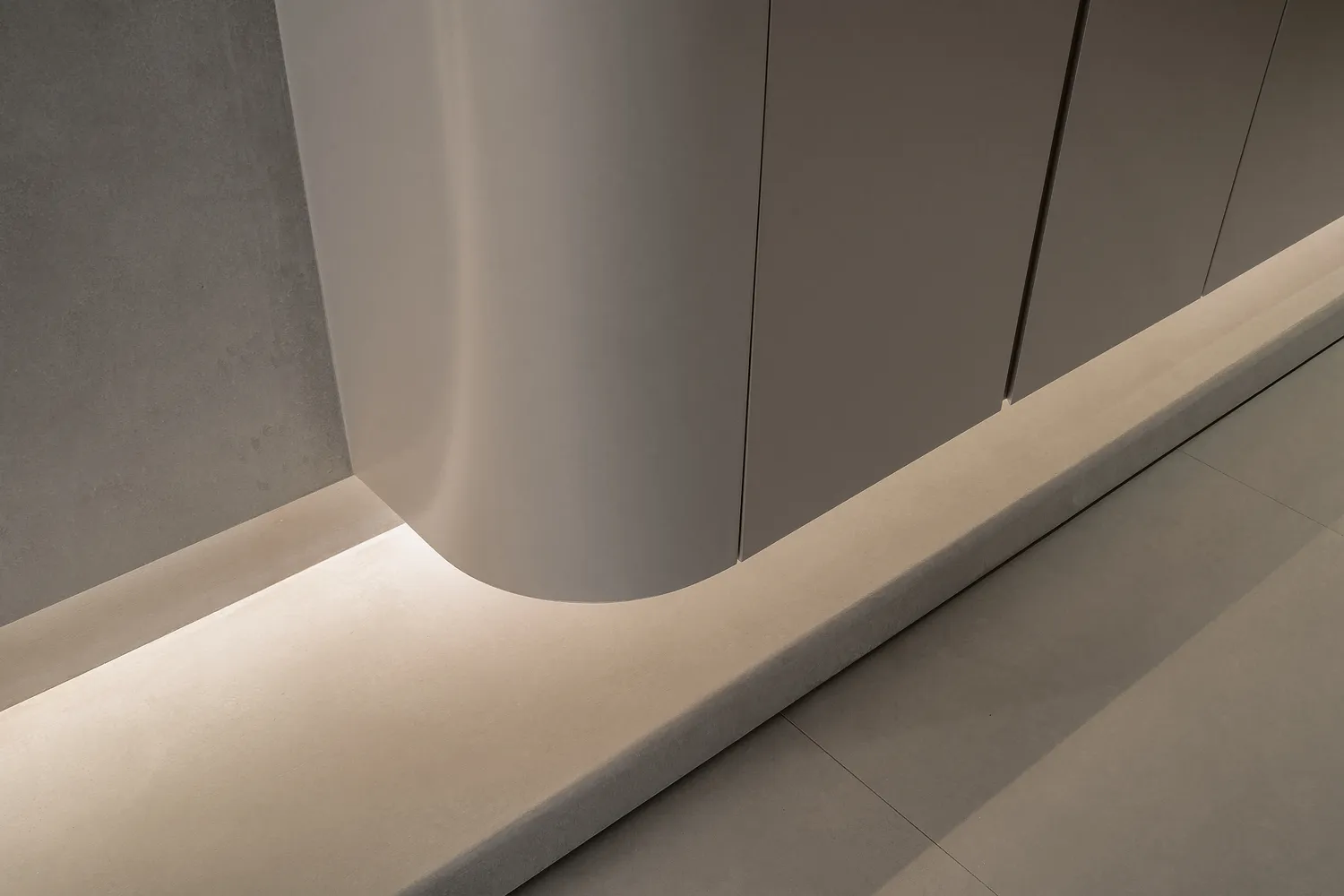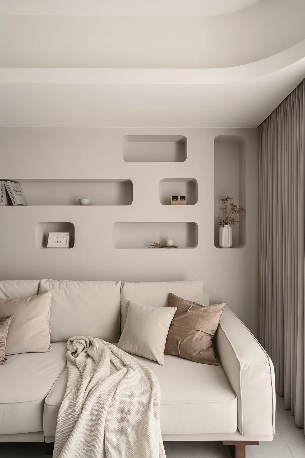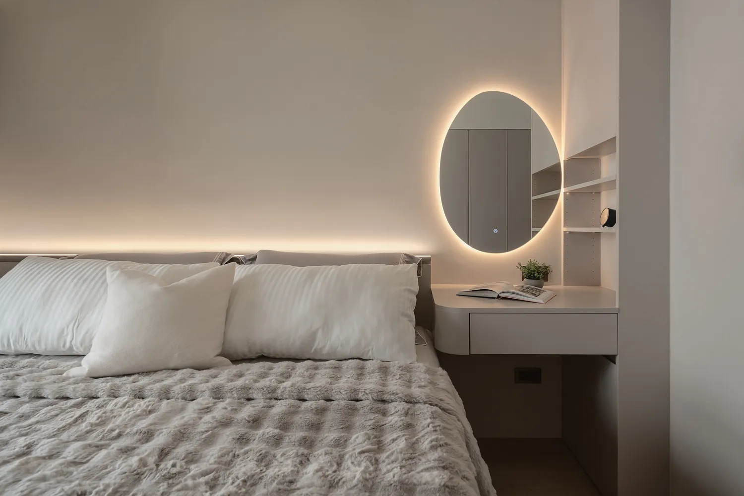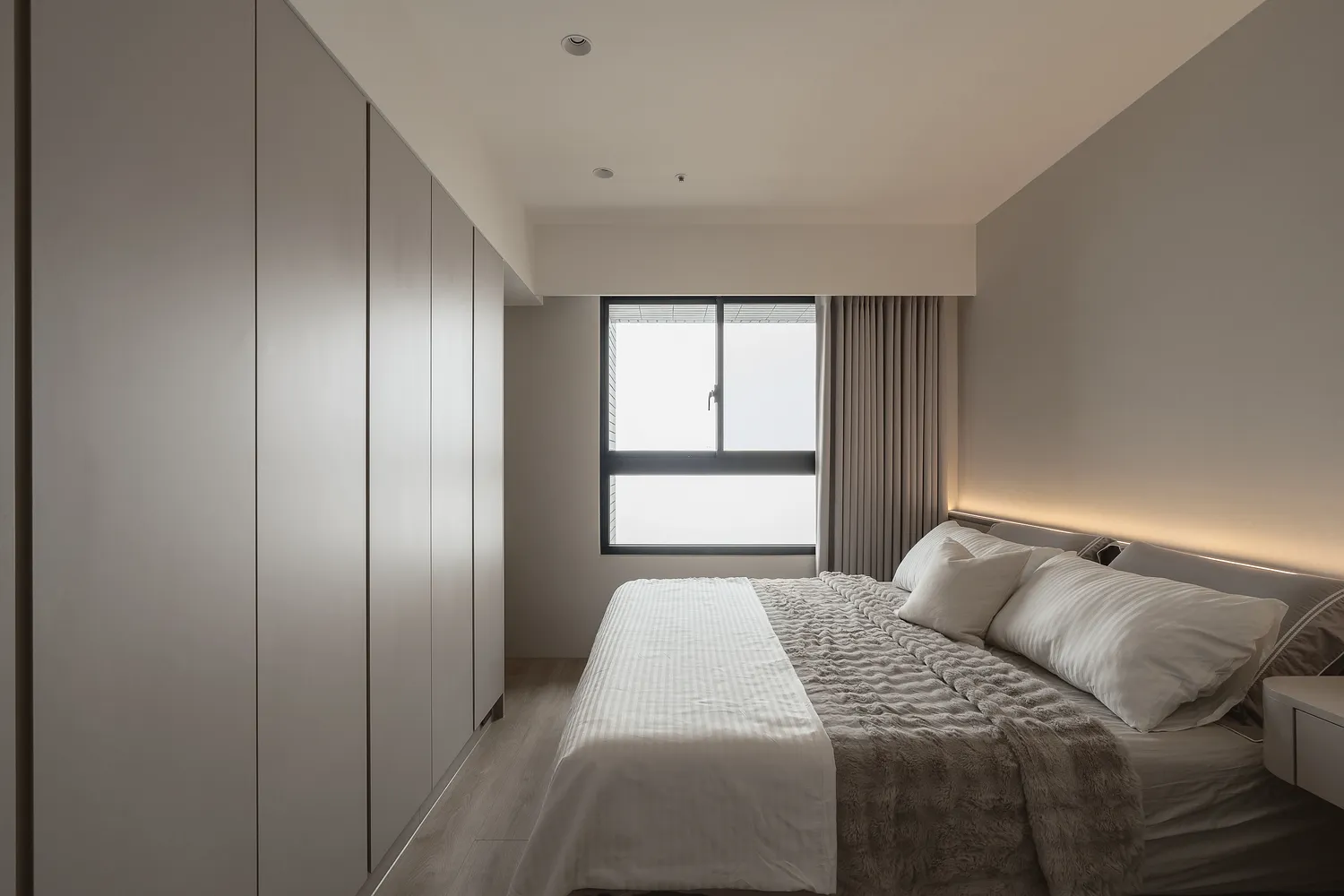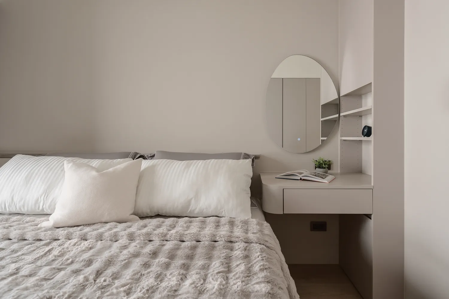 本案以溫潤的燕麥奶茶色系為基底,鋪敘出純淨無壓的視覺感受; 天花板與櫃體轉角運用了大量的圓弧線條,消弭了樑柱的銳利,引導視線隨著空間流動。 沙發背牆的幾何壁龕與臥室那一抹有機光圈,在簡約中勾勒出層次與趣味; 柔和的間接照明輕輕灑落,圍塑出一個讓人卸下疲憊、被溫暖安靜包覆的歸屬。