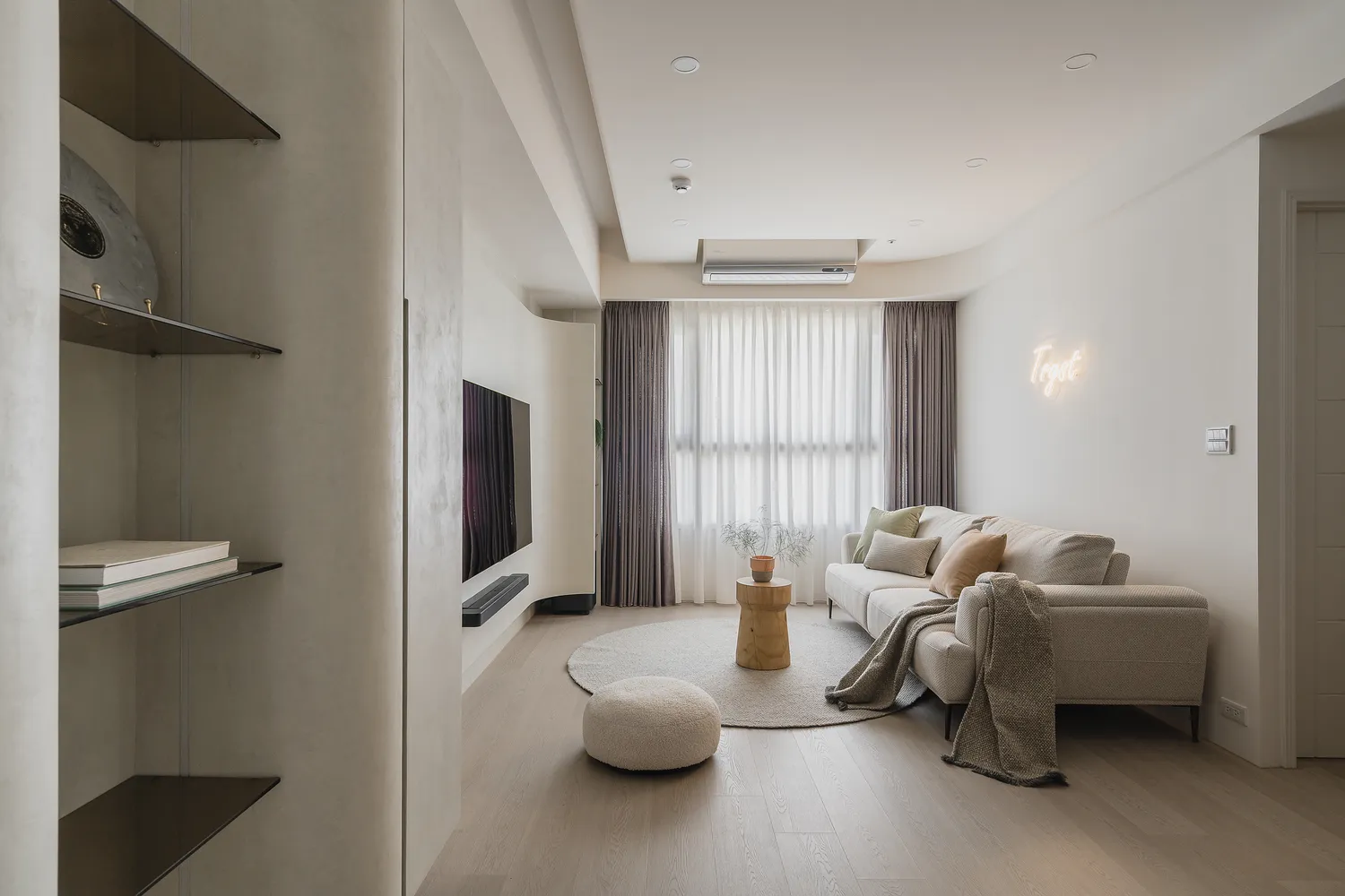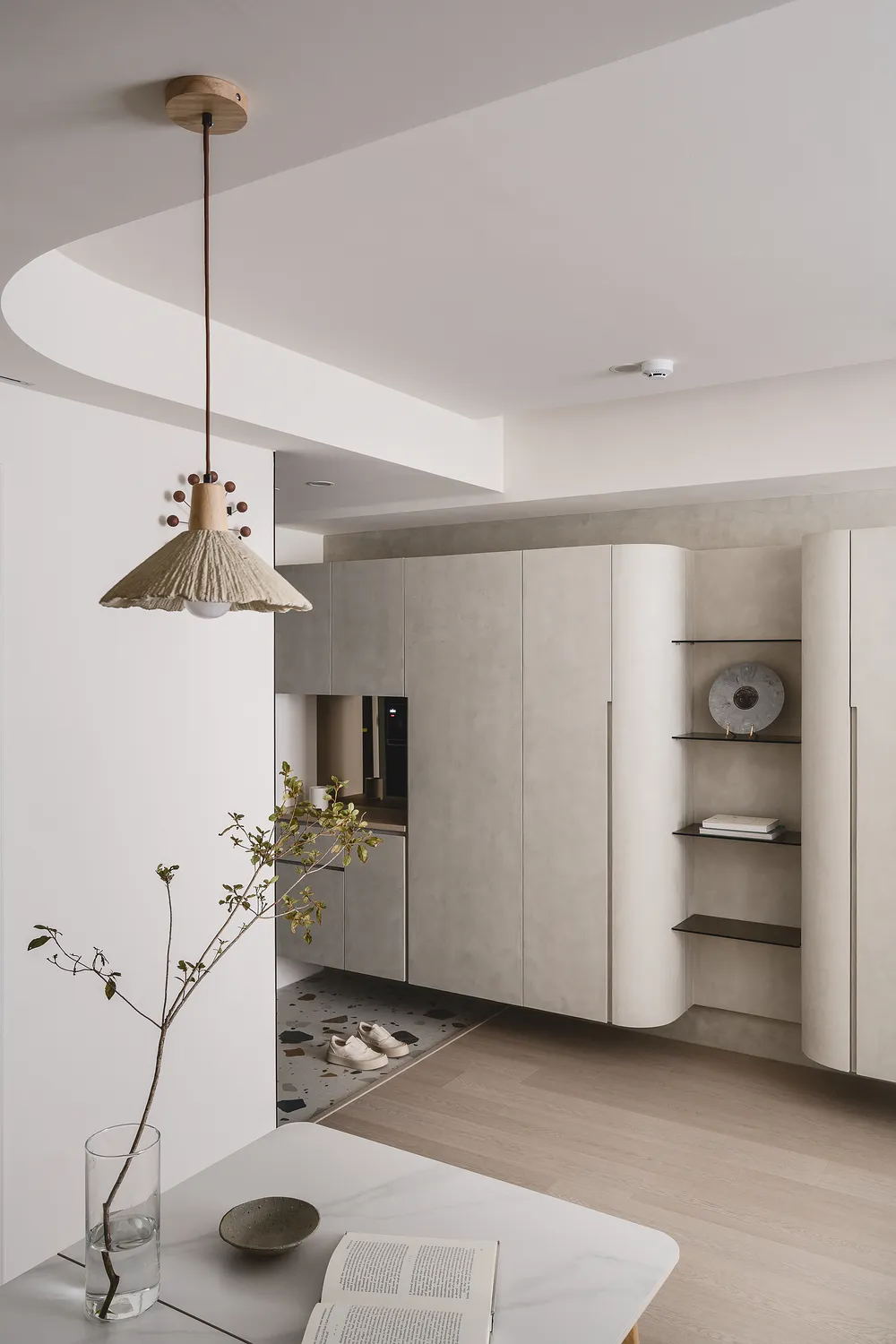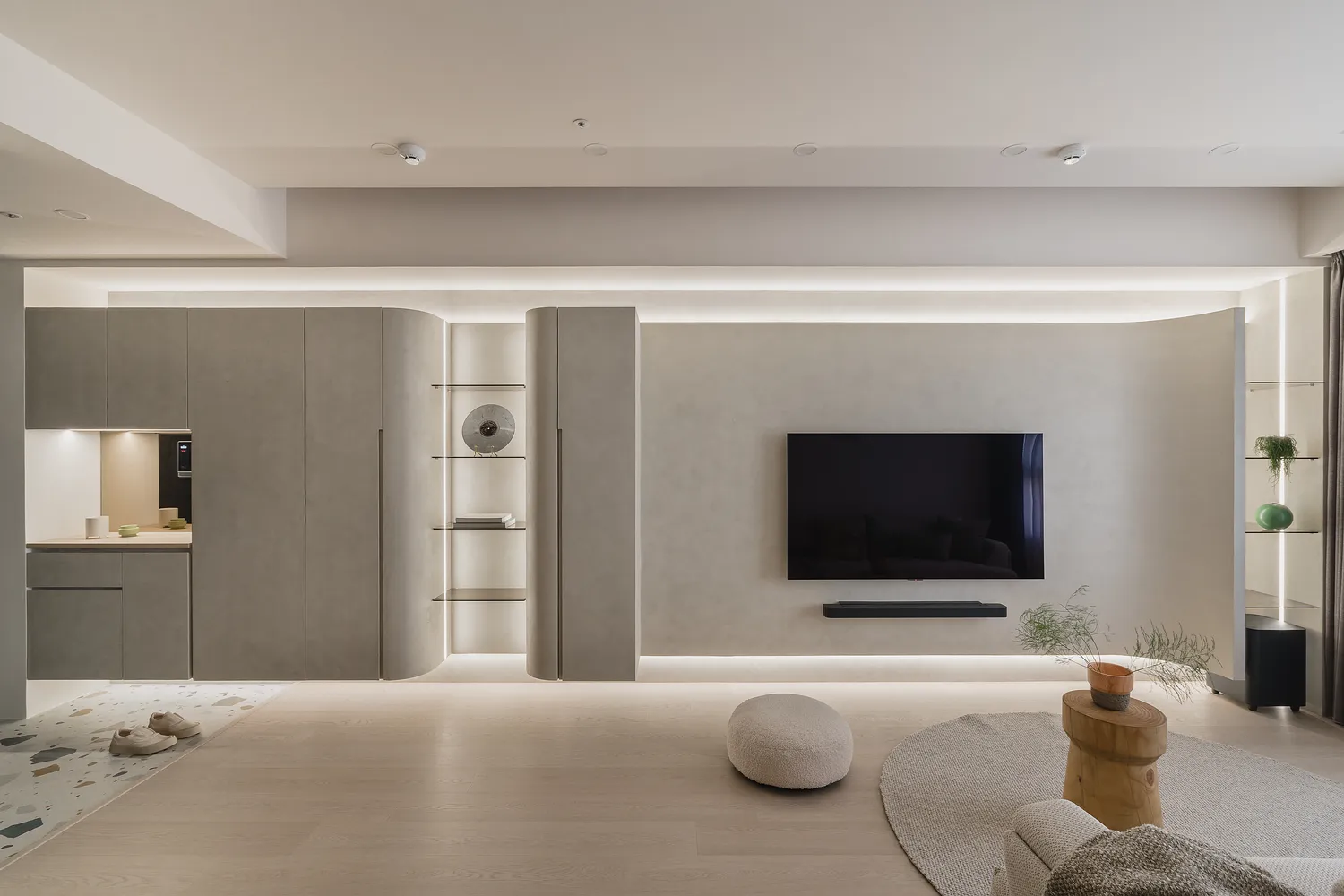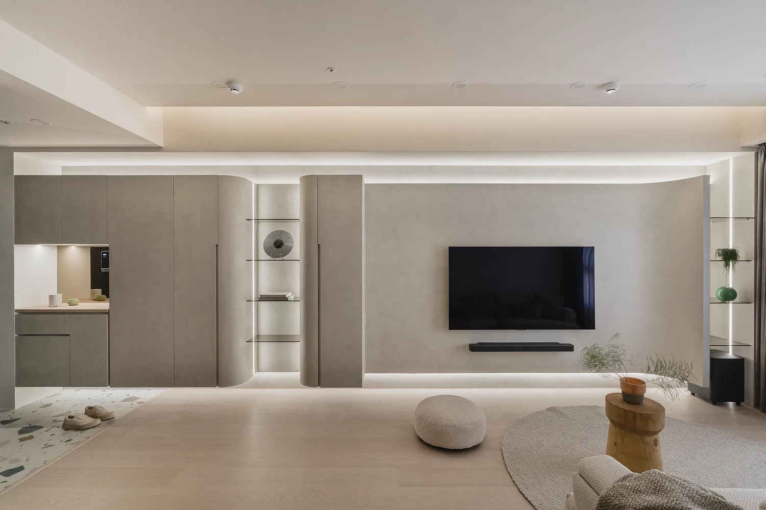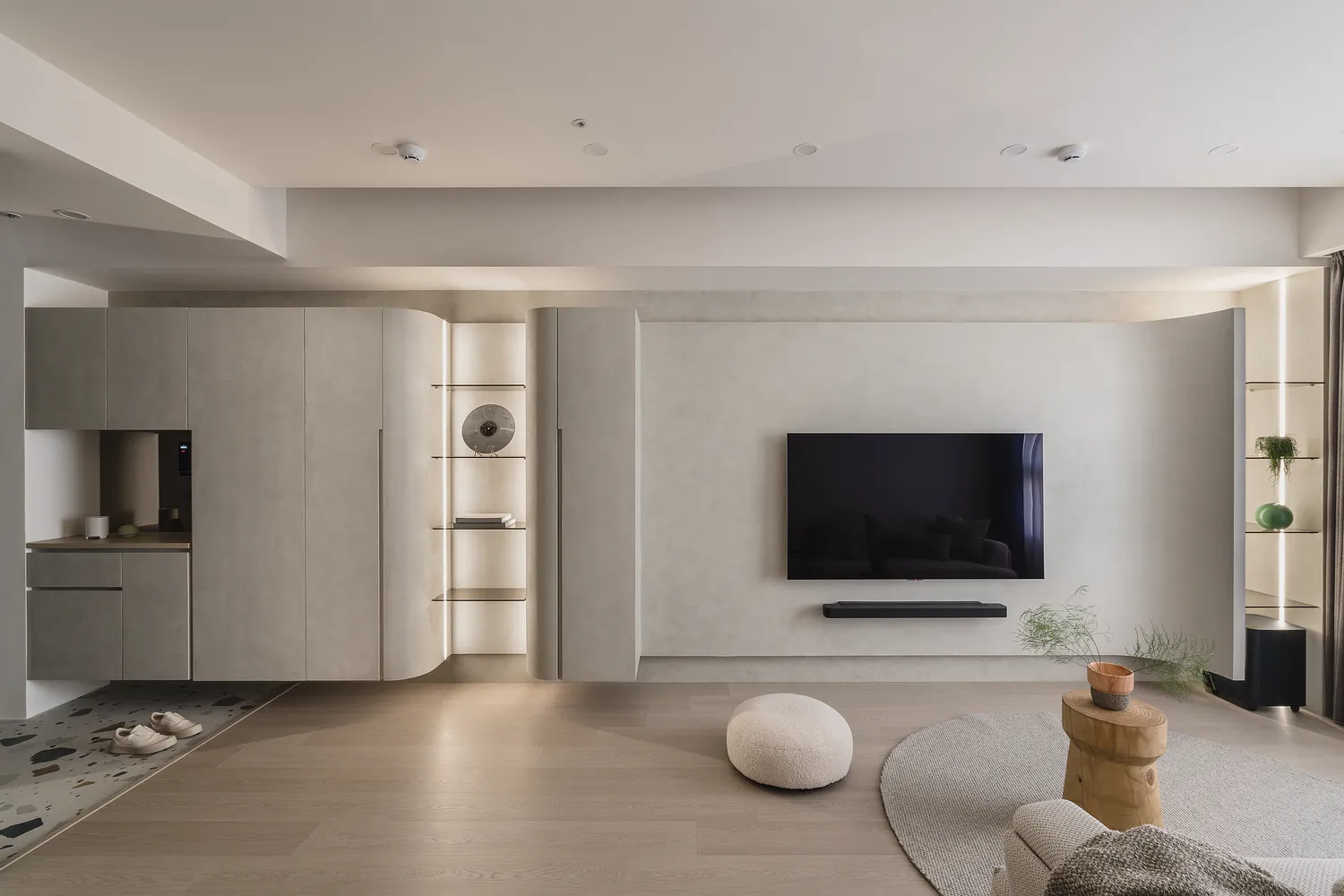 本案以圓弧線條與柔和色調,圍塑出柔軟包容的空間感;