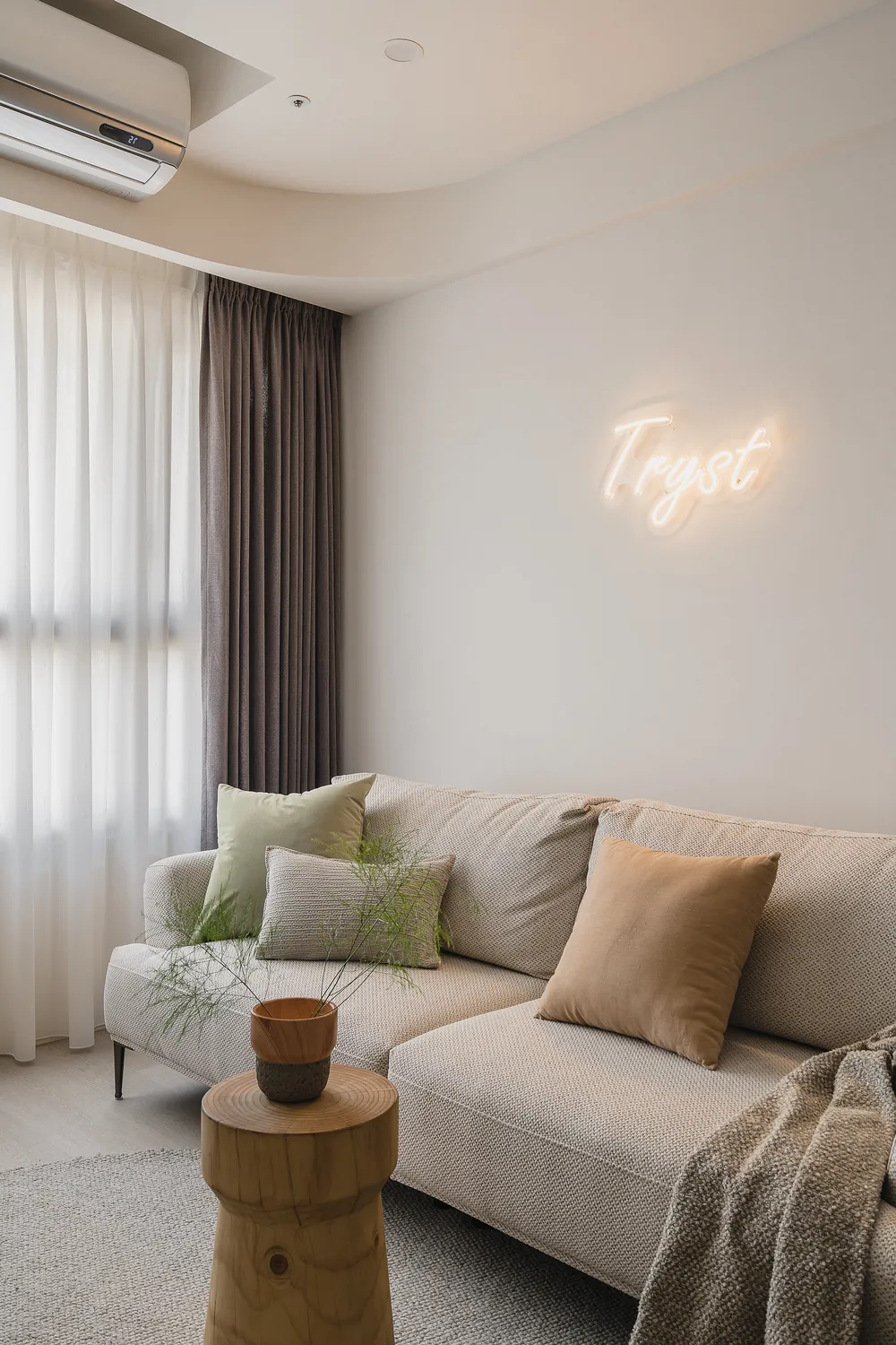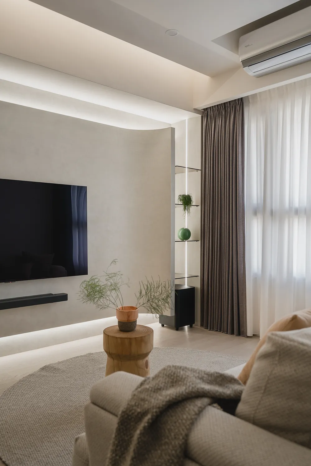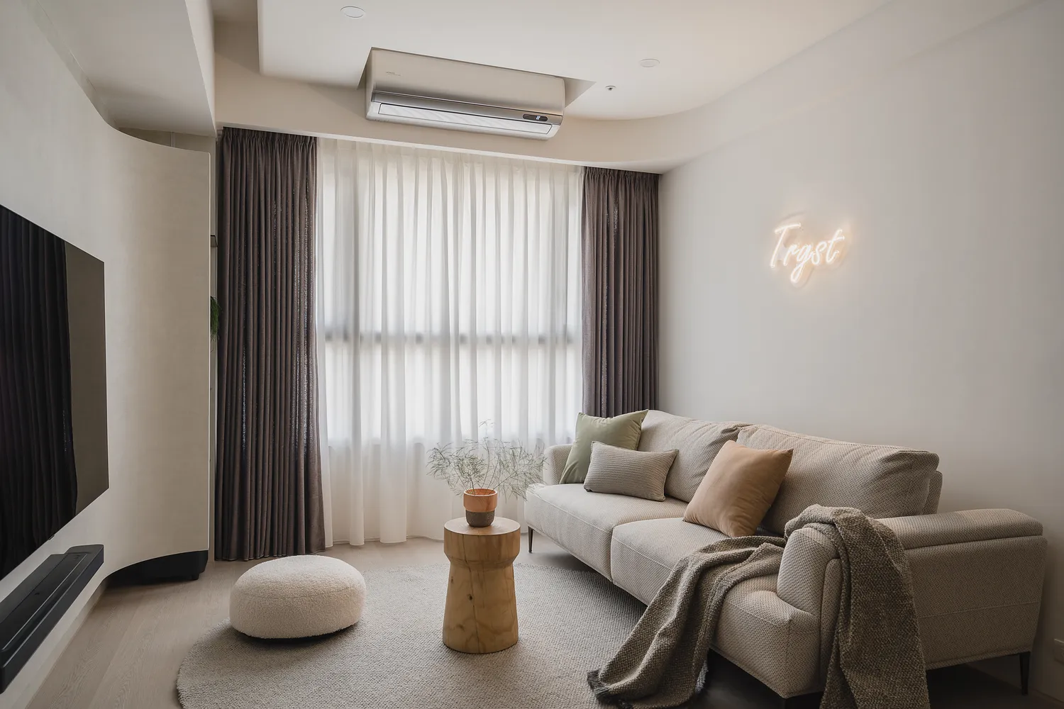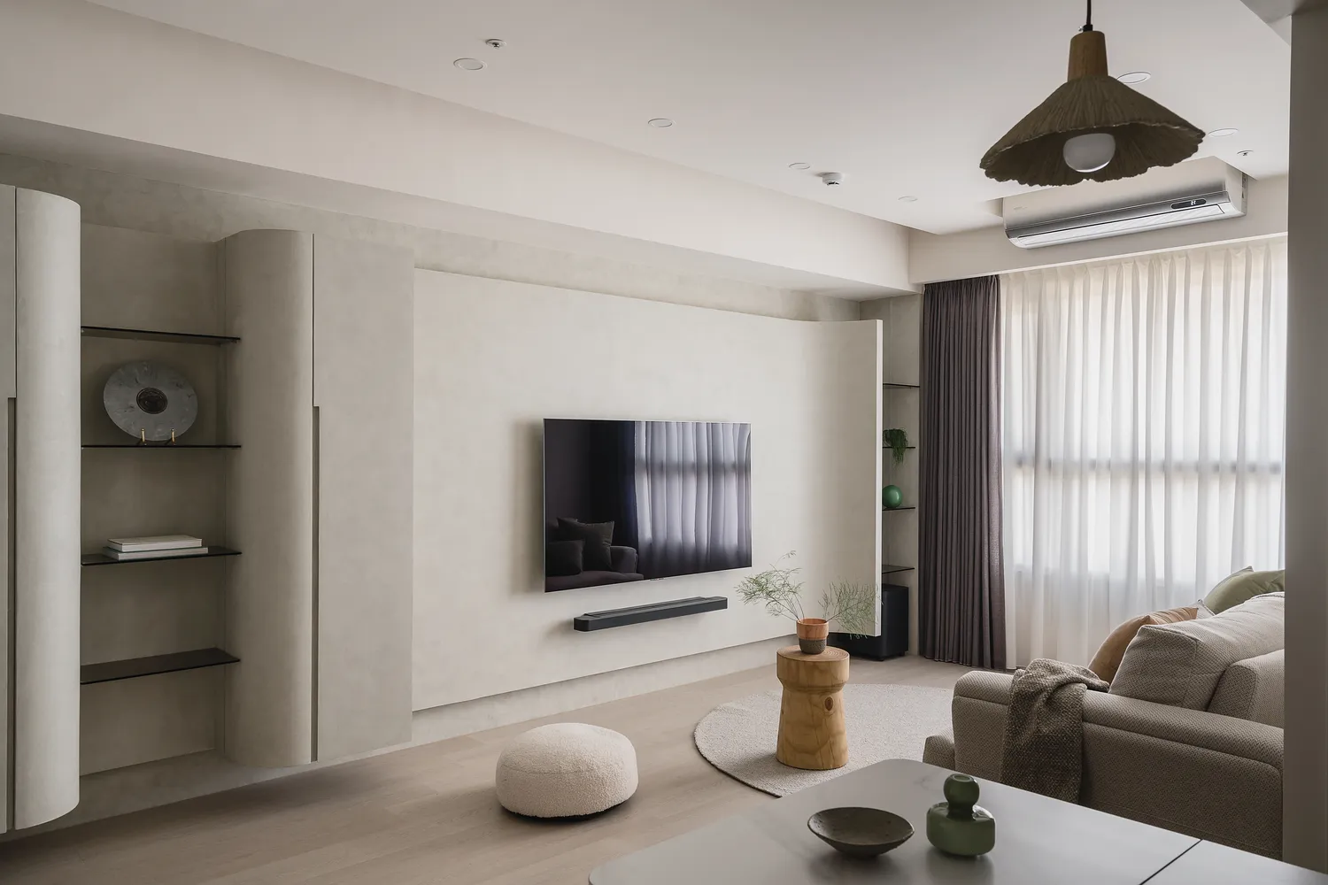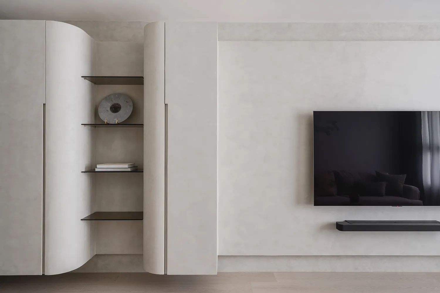 本案以圓弧線條與柔和色調,圍塑出柔軟包容的空間感;